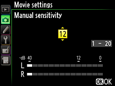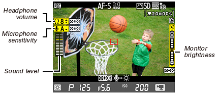 Headphone and microphone settings cannot be adjusted during shooting; before recording, check headphone volume in the live view display and adjust headphone volume and microphone sensitivity as necessary.