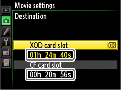 Choose the slot to which movies are recorded. The menu shows the time available on each card; recording ends automatically when no time remains.