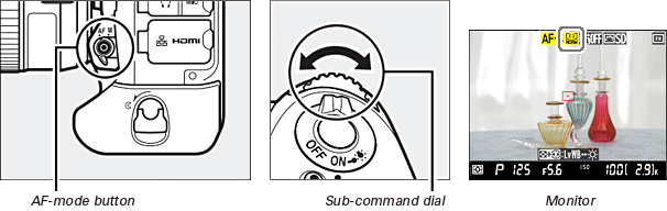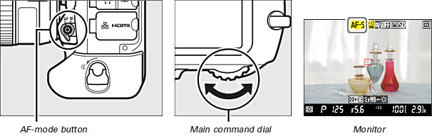 Press the AF-mode button and rotate the main command dial until the desired mode is displayed in the monitor.