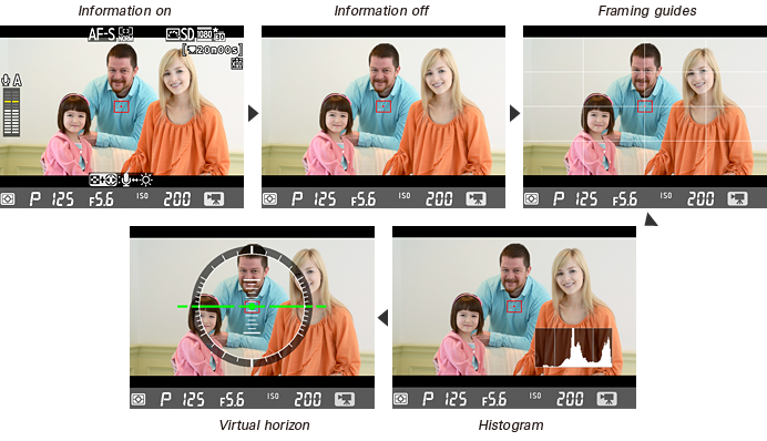 button to choose the information displayed during movie live view. Hide indicators when the camera is connected to an external recording device*.