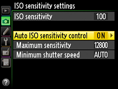 Choose the maximum value available for auto ISO sensitivity control (200-Hi 4). The minimum is ISO 100. |