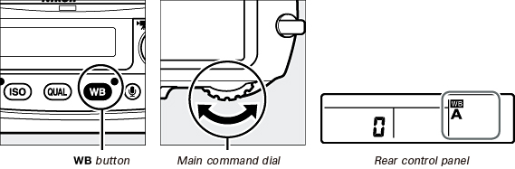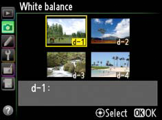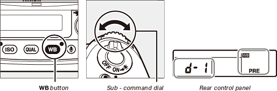 button and rotate the sub-command dial to select from presets d-1 to d-4 to choose a white balance preset.