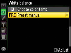 To measure white balance for the selected preset, place a neutral gray or white object under the lighting that will be used in the final photograph and follow the steps below.
