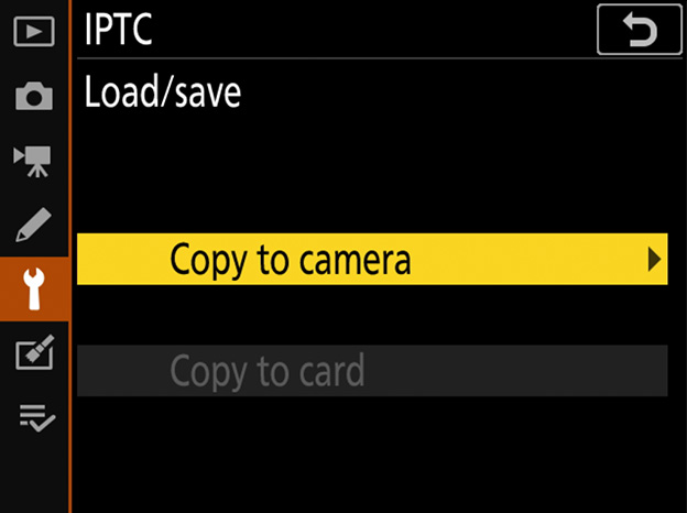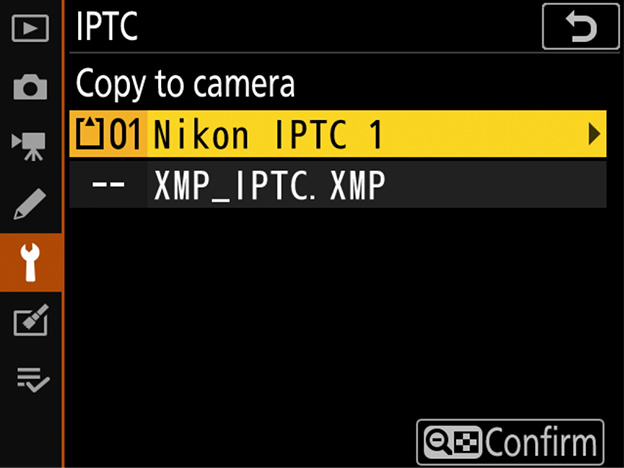 In the setup menu, select [IPTC] > [Load/save], choose the slot in which you inserted the memory card in Step 3, and then highlight [Copy to camera] and press to display a list of the presets on the card in the selected slot.