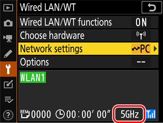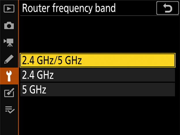 In the setup menu, select [Wired LAN/WT] > [Options] > [Router frequency band] and choose the desired band. Select [2.4 GHz] or [5 GHz] to connect only to networks operating on the chosen band, [2.4 GHz/5 GHz] to connect to networks operating on either band.