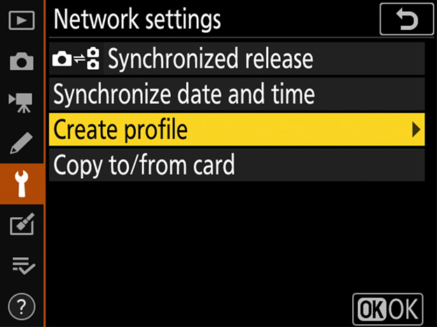 Return to the setup menu and select [Wired LAN/WT] > [Network settings] > [Create profile].