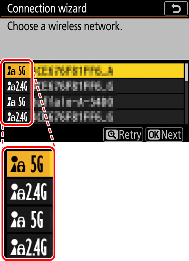 When prompted to choose a connection method, select [Search for wireless network]. The camera will search for networks operating on the frequency or frequencies selected for [Router frequency band] in Step 1. The frequency is shown by an icon to the left of the network SSID. If [2.4 GHz/5 GHz] is selected and the network operates on both the 2.4 and 5 GHz bands, the camera will list the SSID associated with the band detected by the WT-6.