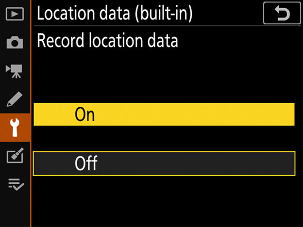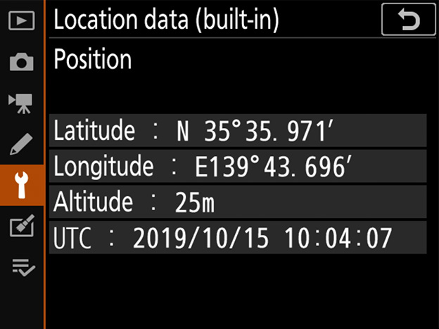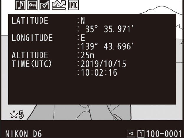 When [On] is selected for [Location data (built-in)] > [Record location data] in the camera setup menu, the camera will record the current longitude, latitude, altitude, and time (UTC, or Universal Coordinated Time) with each new picture taken. The location can be displayed on a map when the pictures are viewed in software such as ViewNX-i. Note that the camera continues to acquire location data even while off; to disable the location data feature, select [Off] for [Record location data].