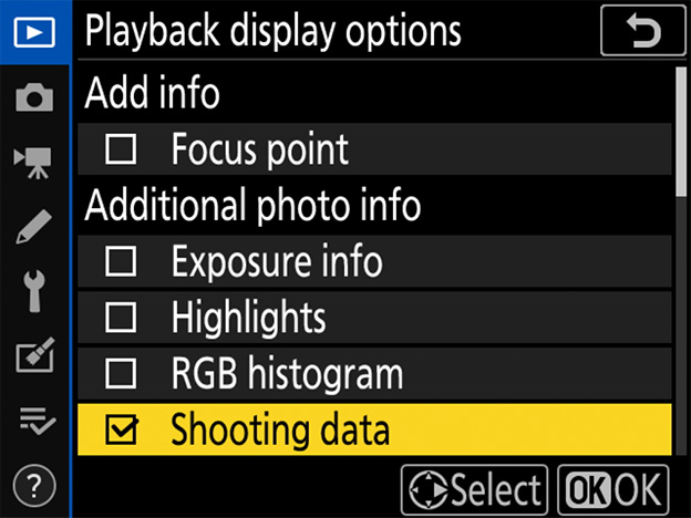 To include location data in the photo info display, select [Shooting data] and [Detailed shooting data] > [Location data] for [Playback display options] in the playback menu.