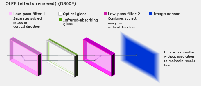 – (Above): With the D800, light passing through the lens that is separated in four segments using a low-pass filter is received by the image sensor. Because separation pitch of the low-pass filter is much shorter than that of the image sensor, moiré and false color reduction can be achieved with minimal deterioration of resolution.