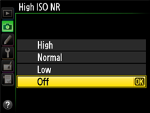 The High ISO NR option in the shooting menu reduces the randomly spaced bright pixels, fog, and lines characteristic of high sensitivity noise, but may leave edges less sharp. A setting of Off or Low may offer a good balance between sharpness and noise even at high ISO sensitivities. The setting can later be changed using Capture NX 2 (available separately) for images recorded in NEF (RAW) format.