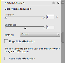 Use Capture NX 2 for more precise adjustment of noise reduction Intensity and Sharpness. For NEF (RAW) images, select the Noise Reduction tool in the Develop section of the Edit List. For JPEG and TIFF images, select Noise Reduction from the Adjust menu.