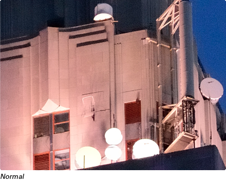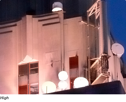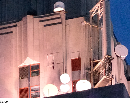 Detailed views of the same subject shot at different High ISO NR settings. Higher settings reduce the noise visible in the sky but also reduce the sharpness of edges in the main subject.