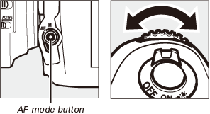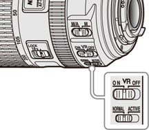 When a VR lens is used, setting the VR switch to ON is recommended. Vibration reduction is activated when the shutter-release button is pressed halfway, stabilizing the view through the viewfinder and making it easier to frame pictures and focus.