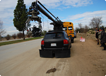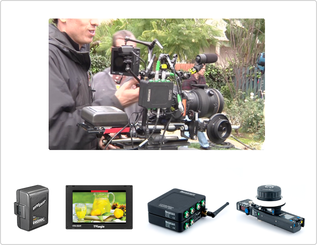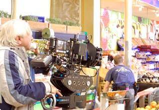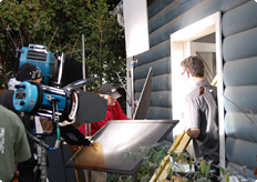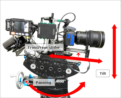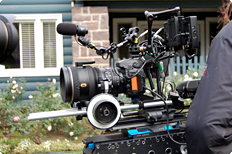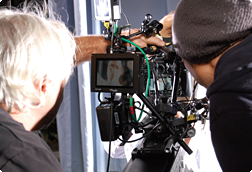 It takes a lot more work to set up and fix a camera in place to take motion pictures than it does to prepare for a still shoot. The camera must be set up so it can pan or tilt precisely and smoothly, allowing the cinematographer to effectively accomplish the camerawork he has in mind. Basically, this is how it works. First, a large tripod is set up precisely horizontal and sandbagged in place. Atop the tripod comes the camera head, which will accept the camera itself. For the D800, it was necessary to make a special adapter to fit the movie camera head. When shooting with a handheld rig, the cinematographer uses a shoulder grip, and the D800 had to have a special adapter for that as well. Crew members called "grips" are in charge of setting up and fixing the cameras in place, and the "key grip" is the team leader.