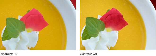 Adjust contrast. Choose negative values for softer contrast, positive values to preserve details in low-contrast subjects.