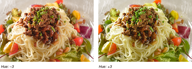 The hue parameter can be visualized as a color wheel. Choosing lower values rotates the wheel counterclockwise, so that the hues at the top of the wheel are replaced by their neighbors to the right. Choosing higher values rotates the wheel clockwise, so that the hues at the top of the wheel are replaced by their neighbors to the left.